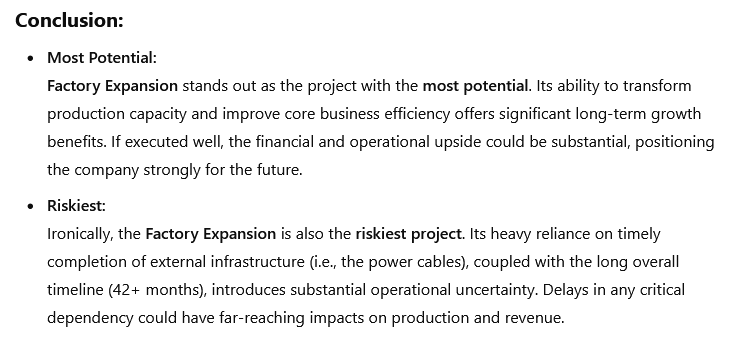| o3-mini-high | Factory Expansion | Factory Expansion | Hohe Klarheit, aber keine Alternativen |