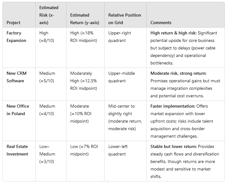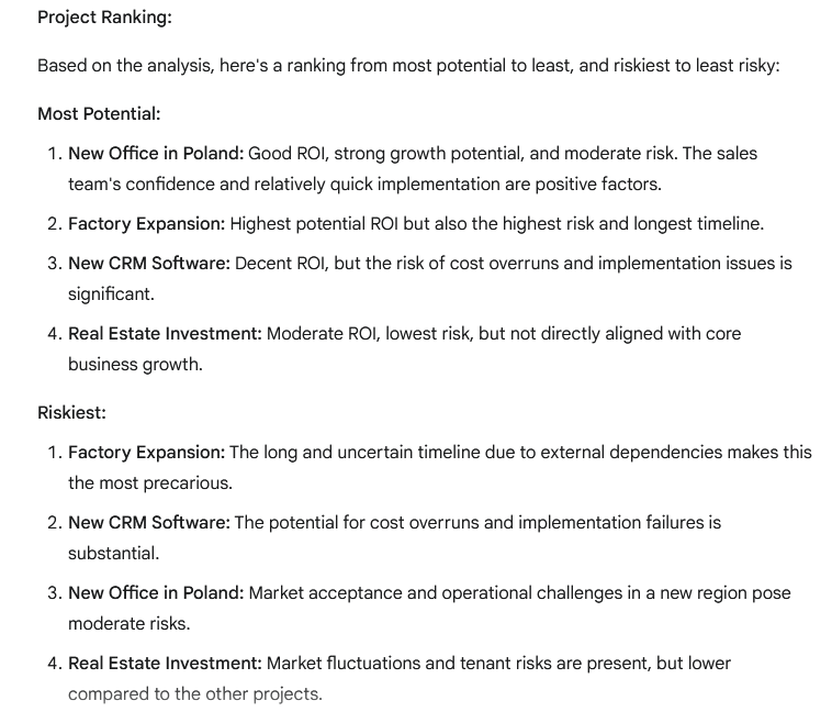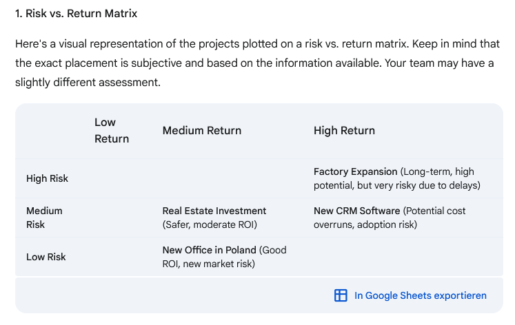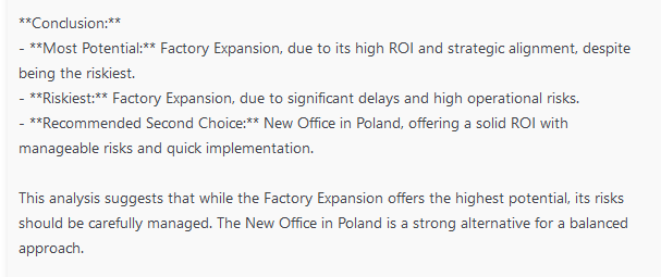 | Gemini Pro | New Office Poland | Factory Expansion | Fokus auf schnelles Wachstum, ignoriert tiefere Risiken |