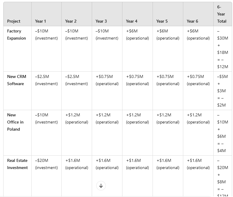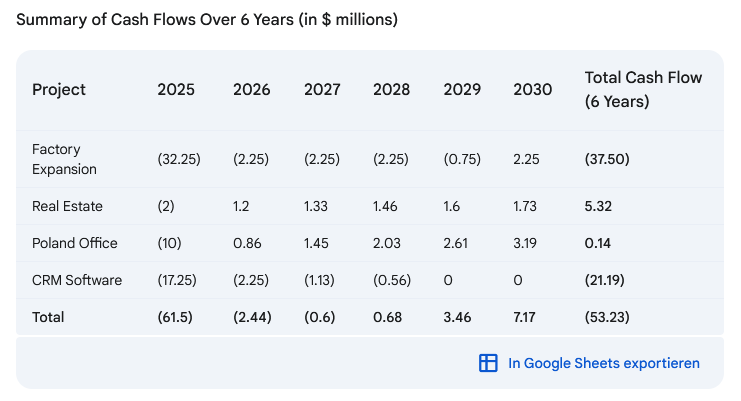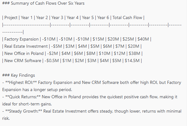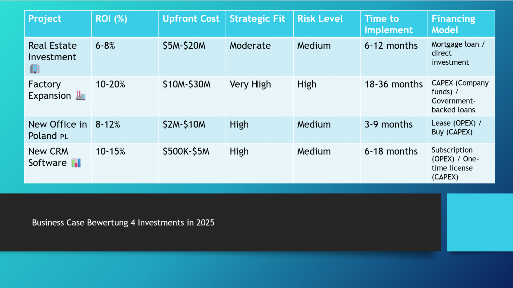 Unser Test: Ein Business Case mit vier Investitionsoptionen – darunter eine Fabrikerweiterung, ein Immobilienkauf, ein neues Büro und eine CRM-Software. Die Modelle erhalten die gleichen Informationen und müssen: